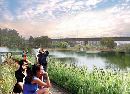 依托現狀地形地貌,打造親水平臺,結合用地規(guī)劃打造條狀小游園。