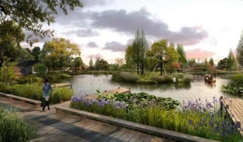 以荷花為主題,堤岸打造木棧道,河岸搭配蘆葦等植物,充分發(fā)揮綠地效益。